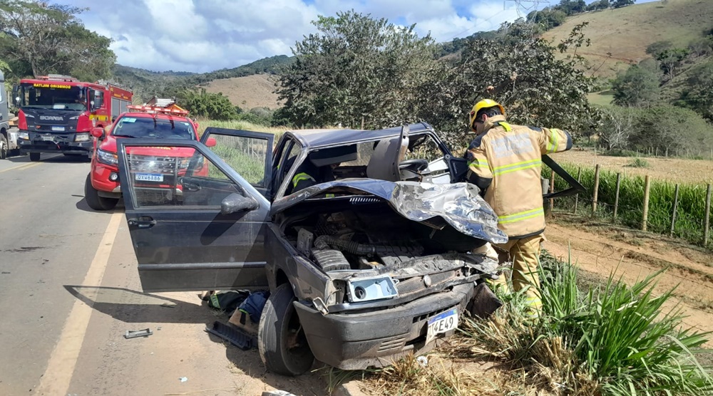 No local, foi constatada a colisão frontal entre dois veículos, sendo que um dos ocupantes encontrava-se preso às ferragens e outra vítima estava dentro do veículo, sem encarceramento, porém com dificuldade de saída.